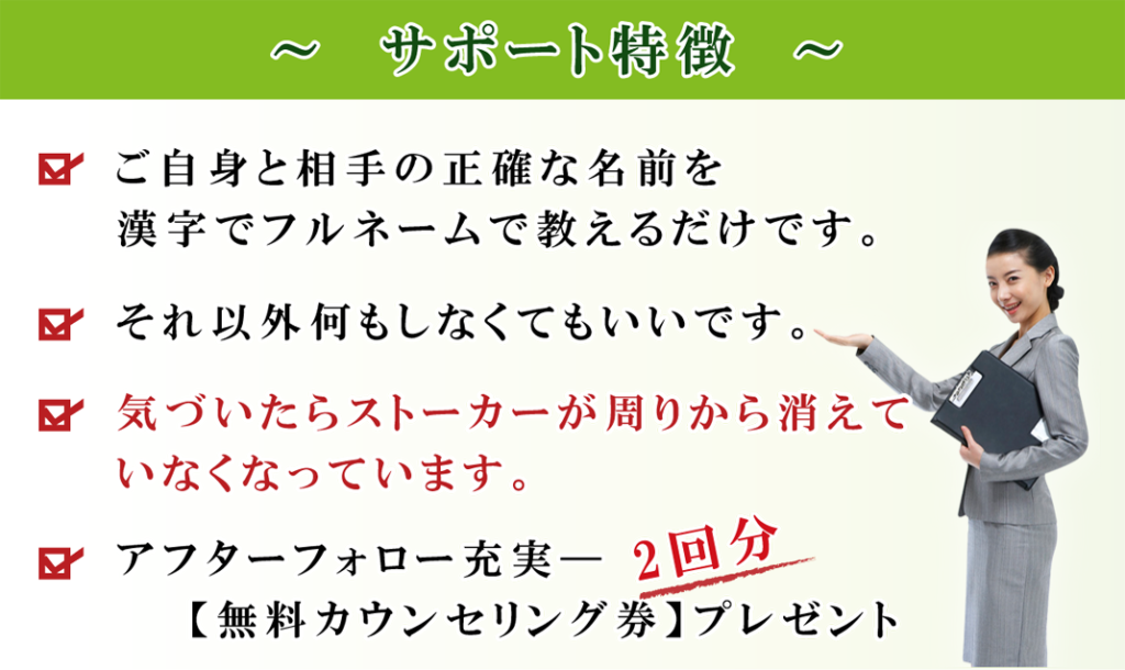 本サポートは悪質なストーカー被害に苦しむ方達を助けるためのものです。本人と偽って他人同士の関係を切り裂くことを防止するため(例えば、不倫相手の夫婦仲を引き裂くなど)必ず確認させて頂きます。未成年者の場合保護者同伴でお願いします。